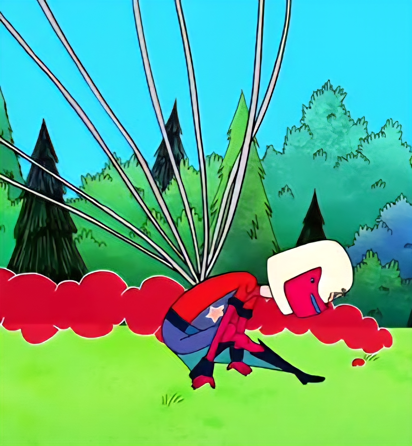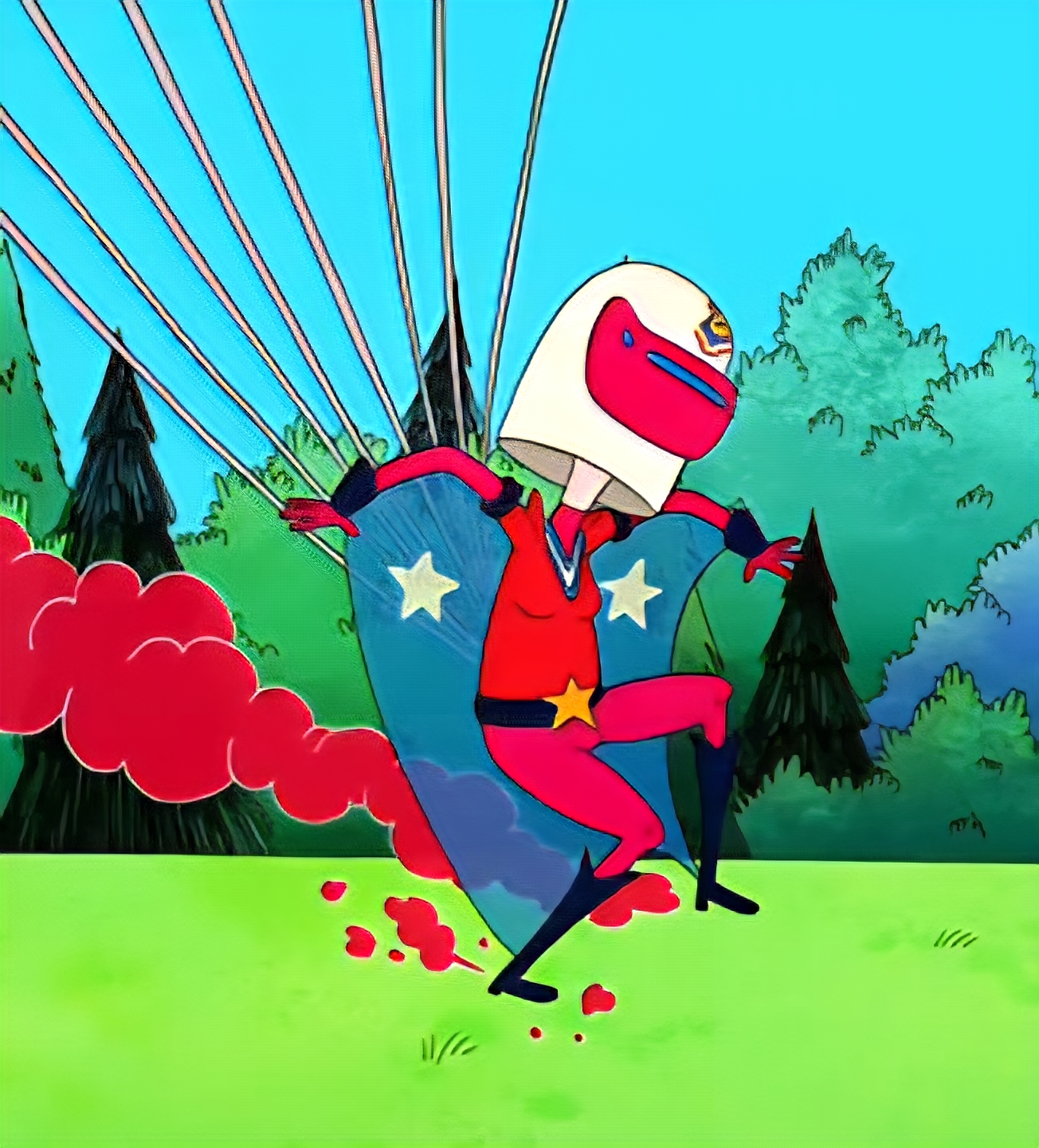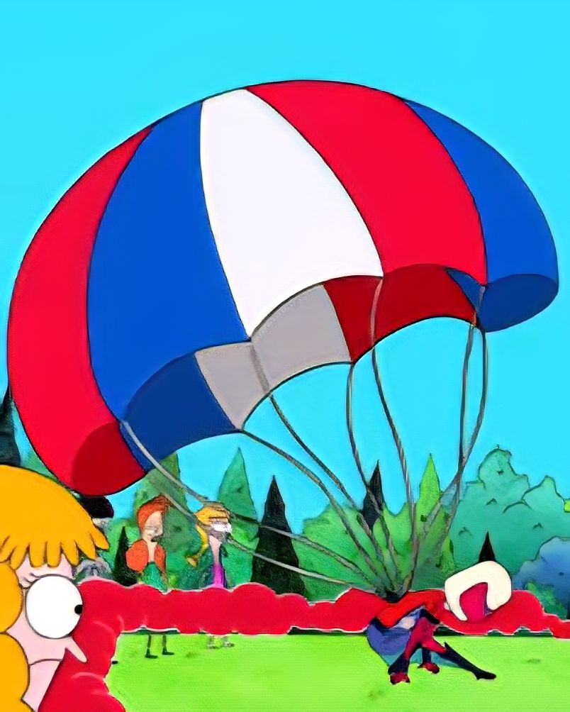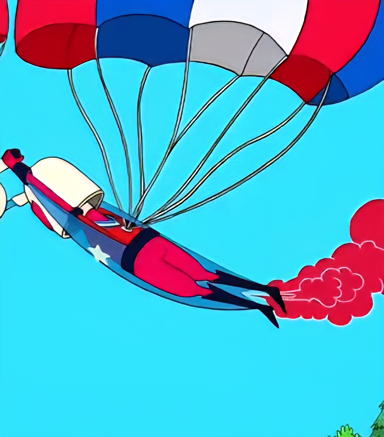 If you give it to her, she'll blow it up till it pops which will keep her distracted if your being chased. Her idle sprite could be seen as her flying in mid air while red smoke comes her jetboots and her blue fabric panels with two white stars flutter while she's flying. And she's in a her front view where you can see her even with her visor goggles from her helemt. Once she does her trick, her parachute would deploy like this and when she lands, she would land like this and it's either a 50/50 chance you get covered and engulfed by her parachute or she gets engulfed and covered by her parachute.