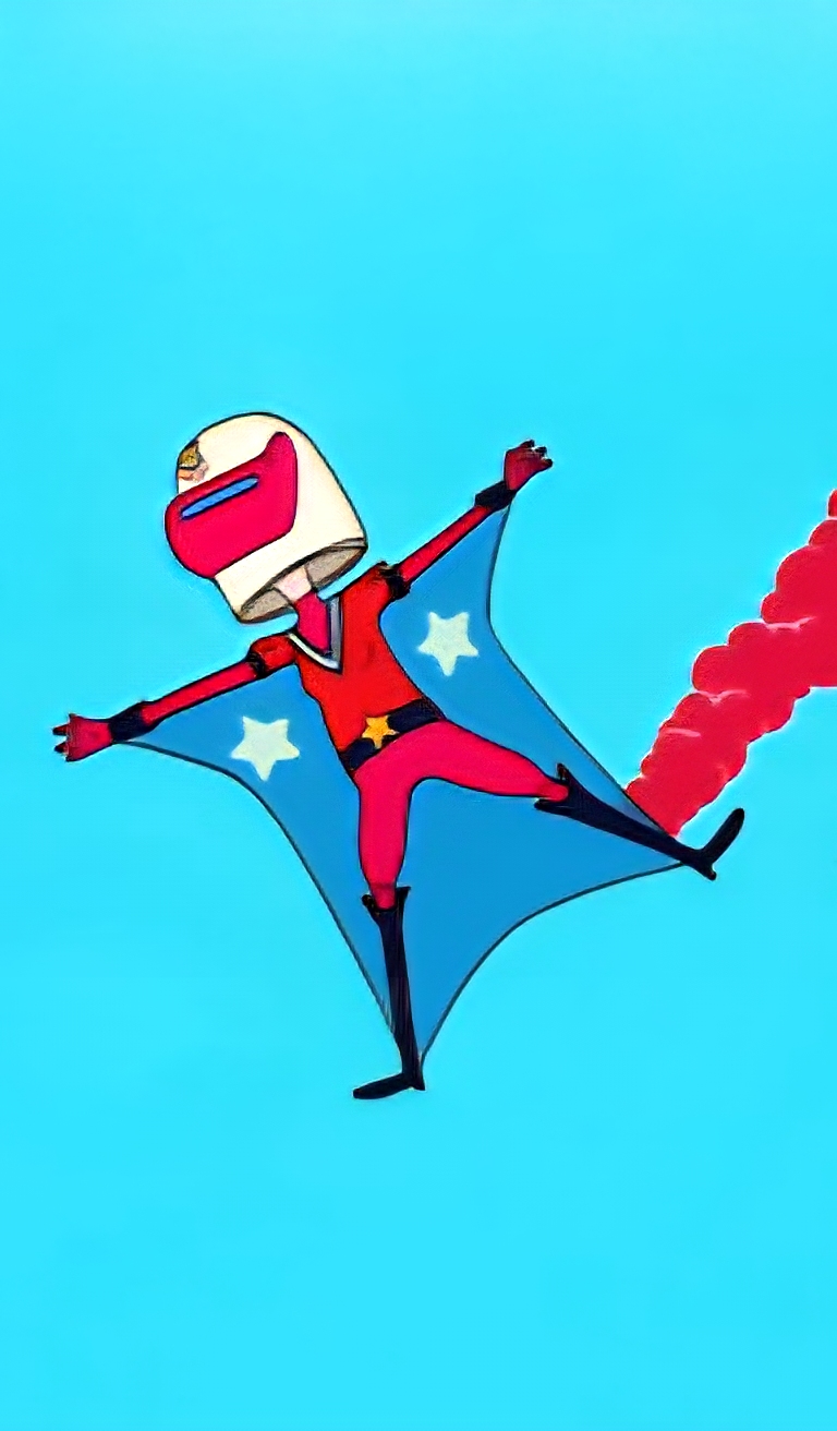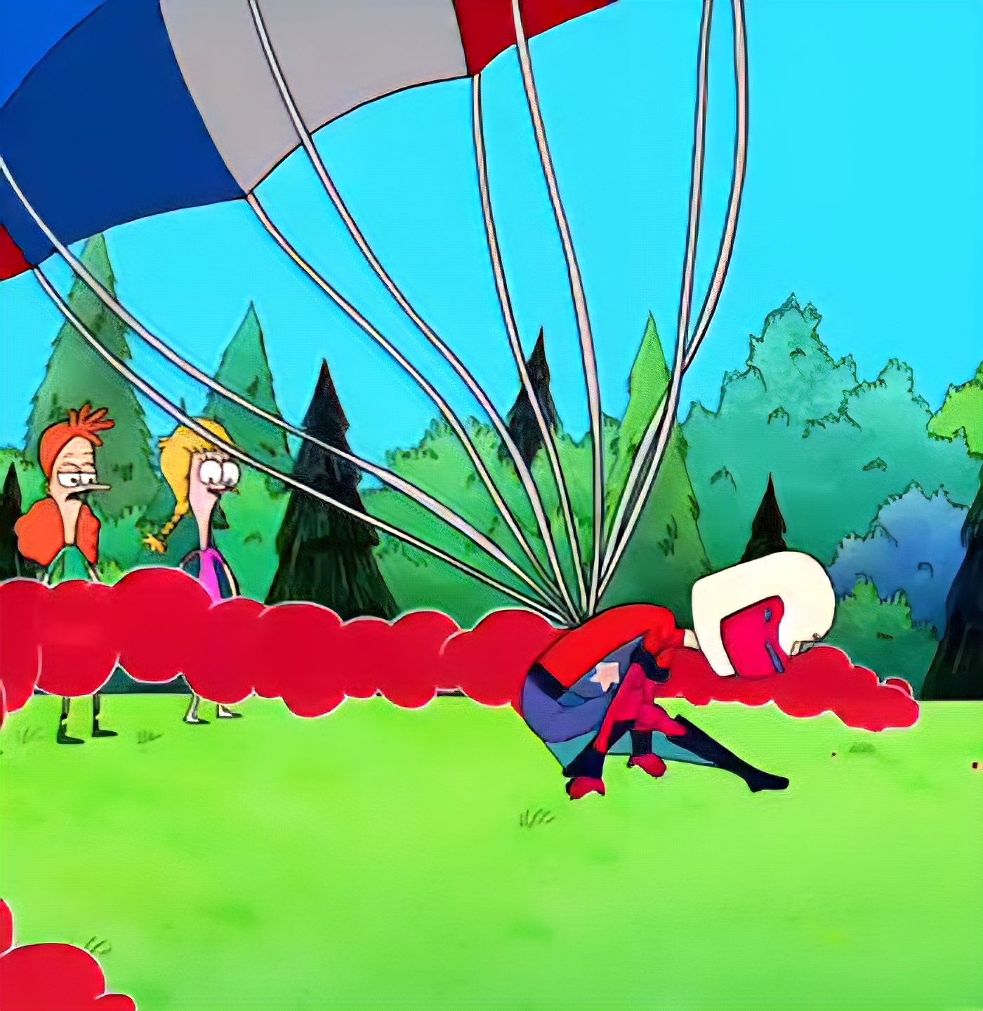 The school needed some action, so we brought a girl who loves flying. She does all sorts of tricks but sometimes her jetboots cut power so she uses her parachute. Be sure to look up in the sky.